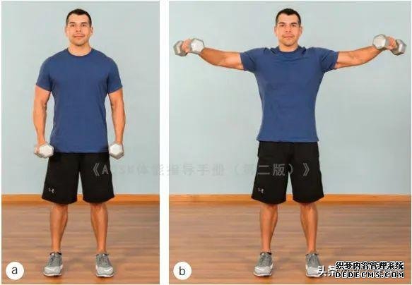 3. 雙手握啞鈴置于體側(cè),掌心向內(nèi),肘部稍彎曲(a)。