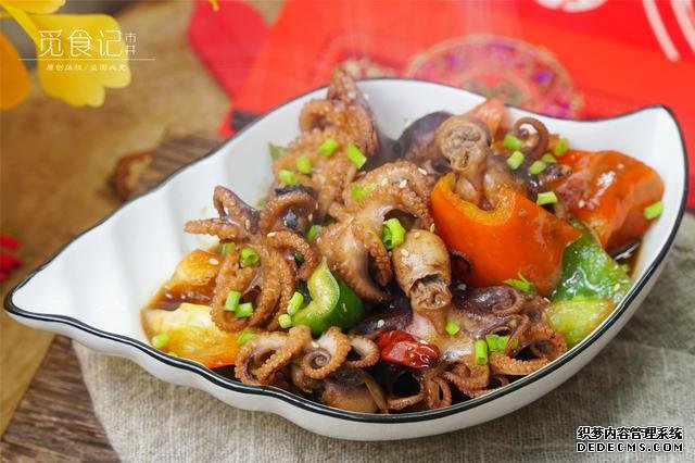 所用食材:小八爪魚1斤,青紅辣椒各1個,蔥姜蒜適量,干辣椒3根;黃豆醬1勺,甜面醬1勺,生抽1勺,胡椒粉1調(diào)羹,糖半勺,鹽適量。