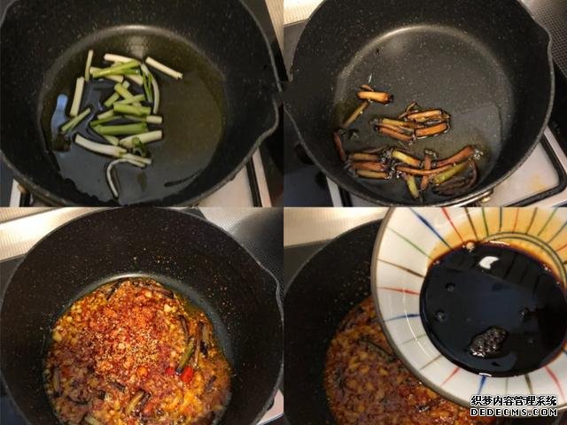 2. 蔥白切段倒入鍋中炸至焦黃關(guān)火,再倒入辣椒粉,大蒜沫,白芝麻、黃瓜絲和酸辣汁混合攪拌均勻
